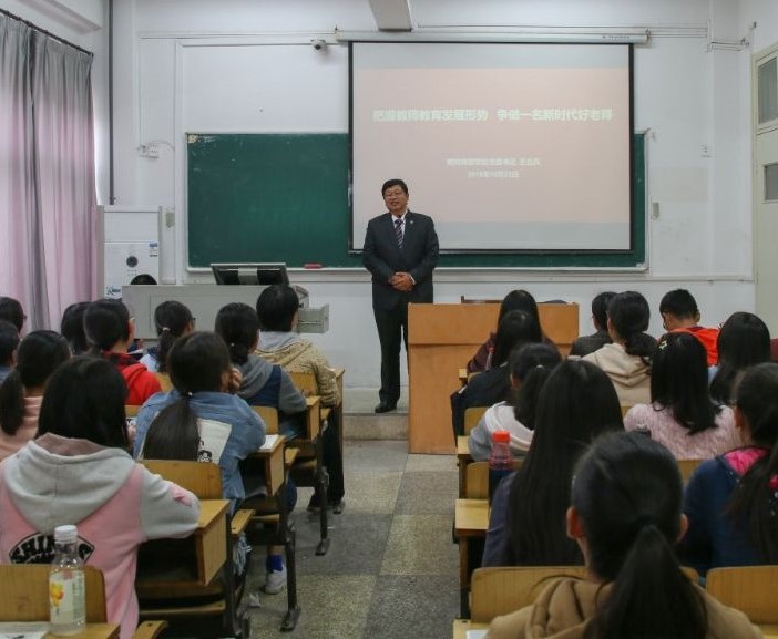 2018年10月22日下午78节课,公司党委书记王立兵来到博学楼219教室,为williamhill中文官网思想政治教育专业2018级员工讲了2节题为“把握教师教育发展形势,争做一名新时代好老师”的形势与政策课。