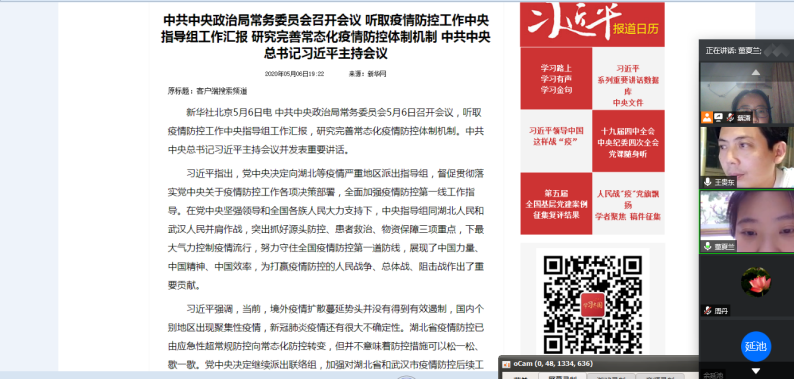 第三项内容是组织委员董夏兰同志领学了11个文件,分别是:《习近平寄语新时代青年强调 坚定理想信念站稳人民立场练就过硬本领投身强国伟业》《中共中央政治局常务委员会召开会议听取疫情防控工作中央指导组工作汇报 研究完善常态化疫情防控体制机制》《中共中央政治局常务委员会召开会议 中共中央总书记习近平主持会议》《习近平主持召开中央全面深化改革委员会第十三次会议强调:深化改革健全制度完善治理体系 善于运用制度优势应对风险挑战冲击》《习近平主持中共中央政治局召开会议 分析国内外新冠肺炎疫情防控形势 研究部署抓紧抓实抓细常态化疫情防控工作 分析研究当前经济形势和经济工作》《习近平在陕西考察时强调 扎实做好“六稳”工作落实“六保”任务 奋力谱写陕西新时代追赶超越新篇章》《<求是>杂志发表习近平总书记重要文章:在打好精准脱贫攻坚战座谈会上的讲话》《习近平给武汉东湖新城社区全体社区工作者的回信》《中共中央办公厅印发的<关于持续解决困扰基层的形式主义问题为决胜全面建成小康社会提供坚强作风保证的通知>》《让干部有更多时间和精力抓落实——中央办公厅有关负责人就<中共中央办公厅关于持续解决困扰基层的形式主义问题为决胜全面建成小康社会提供坚强作风保证的通知>答记者问》《习近平对安全生产作出的重要指示精神》。董夏兰同志把11个文件进行了归纳解读,分为疫情防控、反对形式主义、安全生产三个主题进行综合解读,在解读中加入了自己的思考和体会,真正做到了让同志们边学边思、不断进步。