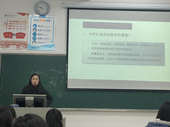 第一次讲座胡霞英老师的主题为“基于三新一旧的教学实施和考试评价的实践与反思”,胡老师从新课改的实际要求出发,为思政专业员工介绍了当前思政课的内容设置与调整。同时对于新课改所要求打造活动型学科课程是如何实施进行了深刻的解读。最后胡老师用“西红柿价值”的实例向思政专业员工展示了如何运用活动情景引导教学。