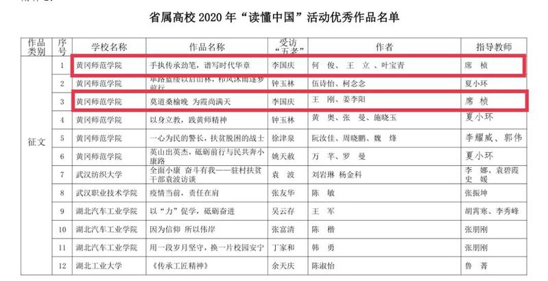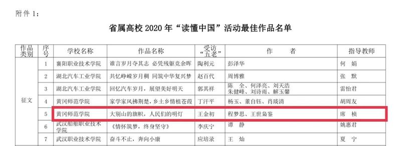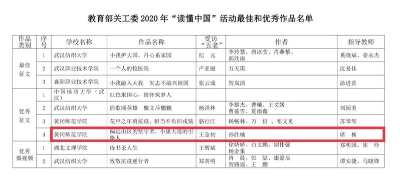 经教育部关工委、省教育厅关工委组织专家组评审,公司获2020年“读懂中国”活动优秀组织奖,在党总支副书记席桢老师的指导下,公司思政思政1802班孙胜楠作品——《偏远山区的坚守者,小康大道的引路人》获教育部关工委2020年“读懂中国”优秀作品,思政1802班程梦思、学科(思政)2020级王世枭鉴作品——《大别山的旗帜,人民们的明灯》获省属高校2020年“读懂中国”活动最佳作品 ,思政1902班何俊、思政1801班王立、思政1802班叶宝青作品——《手执传承劲笔,谱写时代华章》,思政1902班王刚、思政1902班姜李阳作品——《莫道桑榆晚 为霞尚满天》获省属高校2020年“读懂中国”优秀作品。