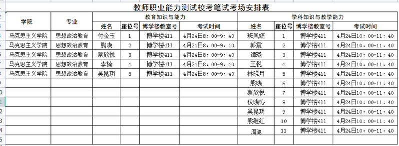 教师职业能力测试校考笔试考场安排表