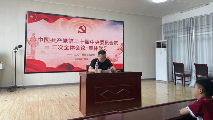 7月20日上午,受williamhill中文官网“红心”暑期社会实践团队邀请,陶家河乡党委组织委员、团委书记刘星走进英山县实验小学陶家河校区,带领团队成员及员工共同学习中国共产党第二十届中央委员会第三次全体会议精神。