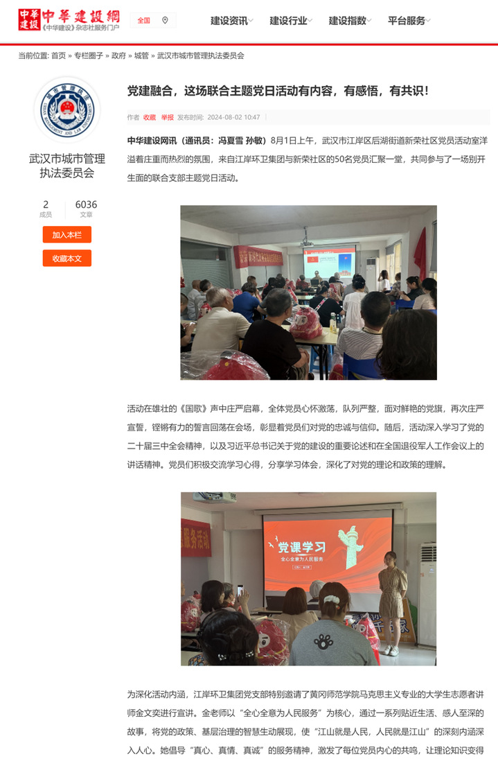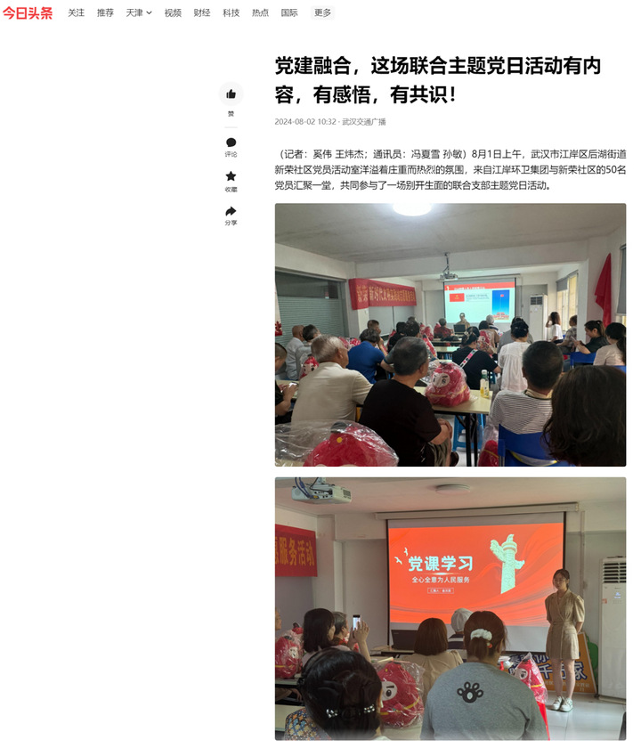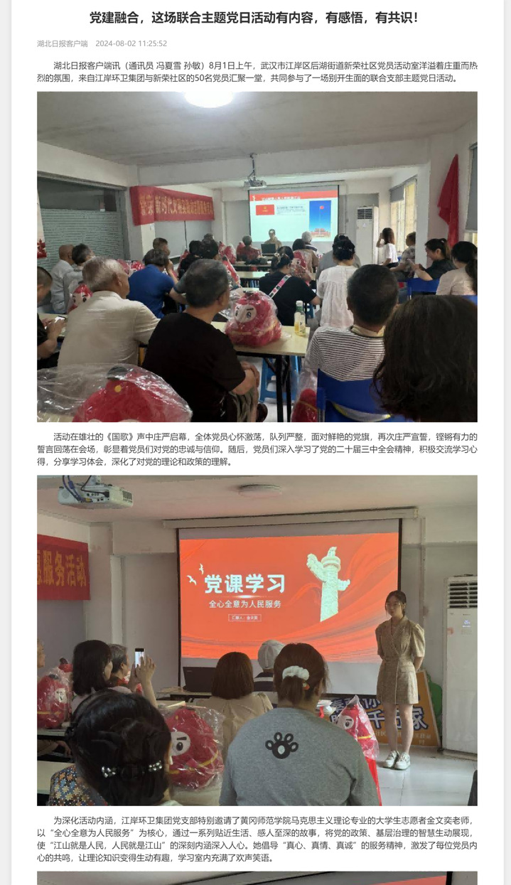 2024年8月1日,公司思想政治教育专业2101班金文奕同学主动参与到武汉市江岸区新荣社区的党日活动中,向来自武汉市江岸区环卫集团与新荣社区的50余名党员开展了党课宣讲。她以《全心全意为人民服务》为主题,饱含对党和人民的真挚情感,用贴近与会党员工作和生活实际的案例,用自己的专业知识和真诚态度让在场的50余名党员感受到了年轻人的激情与青春力量,充分展现了公司在人才培养中的实际成效,赢得了在场党员的一致好评。