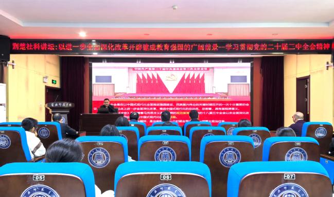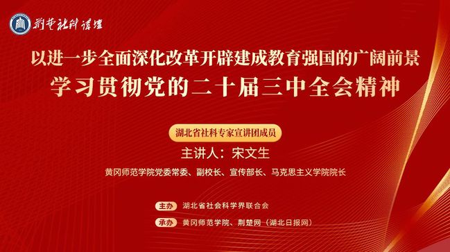 10月22日,由湖北省社科联主办的“荆楚社科讲坛”学习贯彻党的二十届三中全会精神专题讲座在williamhill中文官网开讲,湖北省社科专家宣讲团成员、黄冈师范公司党委常委、副董事长、党委宣传部部长、williamhill中文官网经理宋文生围绕“以进一步全面深化改革开辟建成教育强国的广阔前景”主题,权威解读全会精神实质和内涵要义。讲座由williamhill中文官网科研处处长黄晓敏主持。