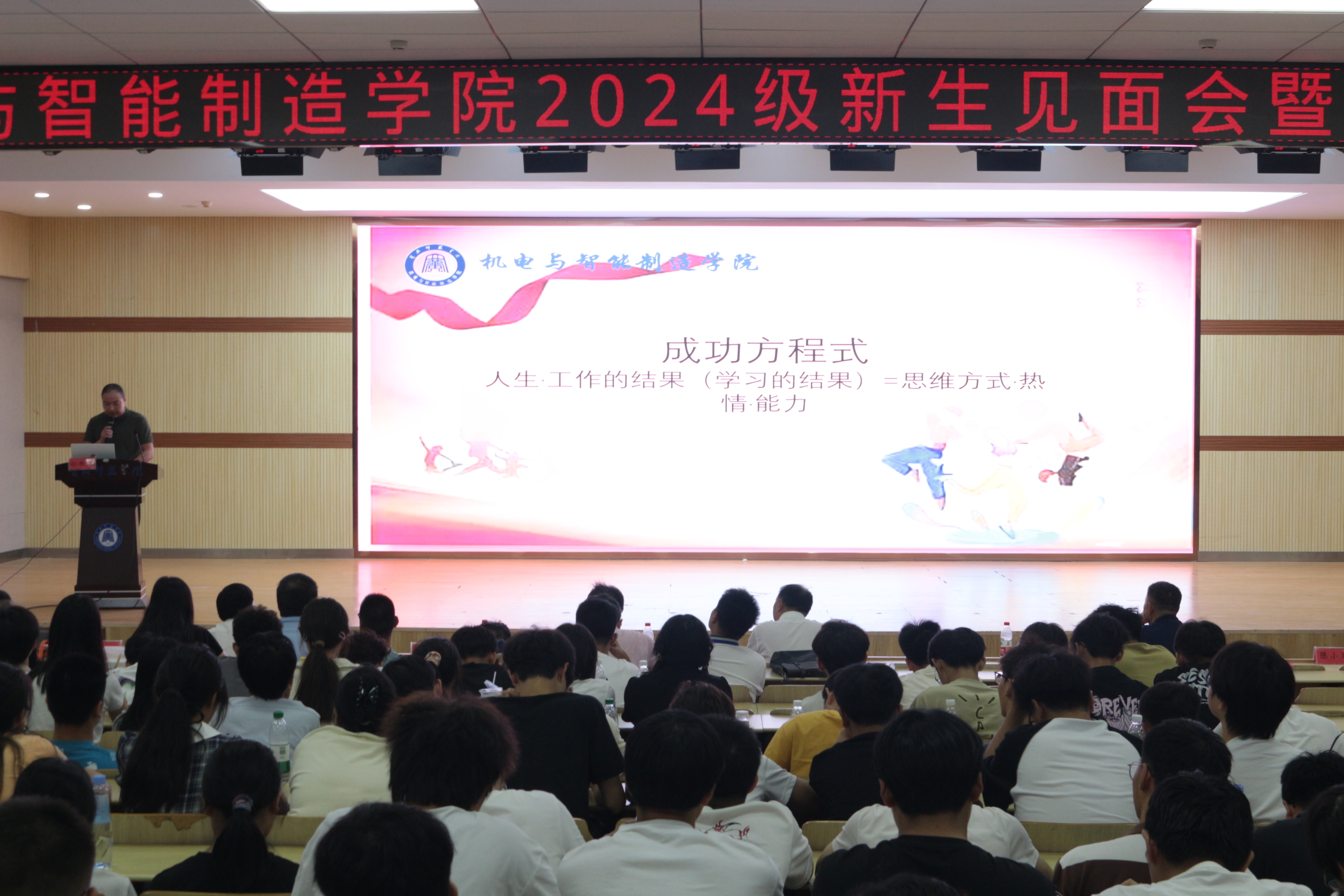 9月11日,机电1992级员工、湖北精诚钢构有限公司董事长孙秋正为机电与智能制造公司2024级新生分享创业成功经历。他引用“人生×工作的结果(学习的结果)=思维方式×热情×能力”的成功方程式作为总结,帮助大一新生制订职业生涯规划和人生规划。