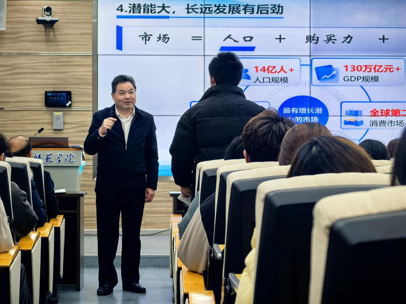 陈向军以“我国经济应对外部冲击的能力底气何来”“我国为何要促进民营经济发展壮大”“我国做强国内大循环如何实现”三个核心问题为切入点,从复杂多变的国际形势入手,深刻剖析了中国经济行稳致远的制度根基与发展优势。他指出,中国特色社会主义制度优势、超大规模市场优势、完整产业体系优势与丰富人才资源优势,是应对外部风险挑战的核心底气;民营经济作为稳定增长、促进创新、增加就业的重要力量,其发展壮大是激活市场活力的关键举措;而做强国内大循环,需聚焦资源要素高效配置、科技创新与产业创新深度融合、产业链供应链自主完备、促进城乡区域协调发展等四大重点,通过扩大内需与深化供给侧结构性改革形成发展合力。授课中,他结合2025年消费品以旧换新带动万亿级消费、深度求索(DeepSeek)模型性能优势等鲜活案例,将抽象经济理论转化为可感可知的实践图景,让课堂既有理论高度又有现实温度。